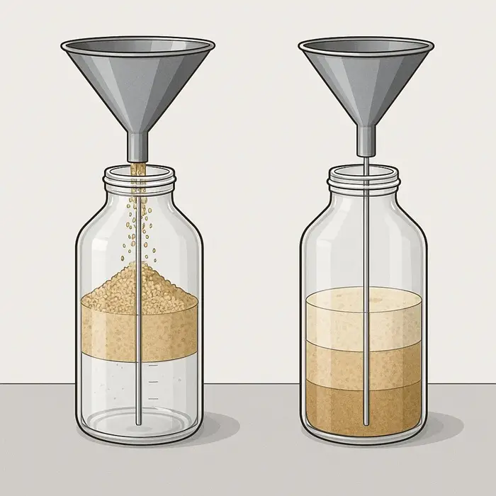 Segregation leads to a non-uniform mixture, resulting in inconsistent dosing—especially problematic in sectors like food, feed, and pharmaceuticals. This issue becomes even more pronounced when the silo discharges through funnel flow, which further exacerbates particle separation. Managing segregation is crucial to maintain a consistent, reliable mixture for precise dosing and product quality.